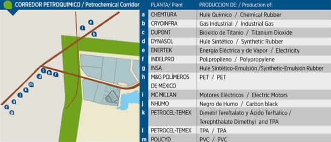 Nowadays Tamaulipas is the most important producer of plastic resins in Mexico, since more than 2 million tons are manufactured annually, representing 70% of the production capacity installed in the Country. Also, 30% of all the private chemical and petrochemical production is generated in the Altamira region. The main products include Titanium Dioxide (white pigment), Polyvinyl Chloride (PVC), Terephthalic Acid (TPA), Terephthalate Polyethylene (PET) and Terephthalic Dimethyl. 100% of the synthetic rubber production in Mexico is originated in Altamira, making this corridor the biggest Petrochemical Cluster in Mexico.
